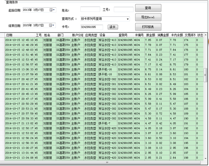 志控一卡通消费系统消费明细包括人员姓名,工号,部门,所在账户名称,应用类型名称,消费的日期时间,哪台设备上消费,持卡人卡号,卡片编号,消费金额,扣费前金额,扣费后金额,交易序列号等内容。
